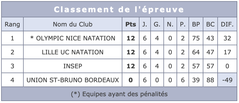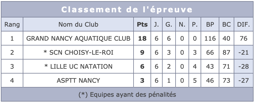 - 3/4ème place : Lille UC Natation - ASPTT Nancy : 13-5