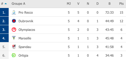 Dans ce groupe B, trois équipes ont déjà fait le trou en haut de tableau avec trois victoires en quatre rencontres. La quatrième qualifiée, le Waspo Hanovre, étant déjà connue car club hôte du Final 8, l’enjeu est d’obtenir le meilleur classement possible pour affronter un moins bien classé de l’autre poule, en quarts de finale. Ainsi, on a pu assister à la belle remontée du Ferencvaros qui est parvenu à passer devant Barceloneta en fin de rencontre. Dans le même temps, Brescia est également venu à bout de Jadran Herceg Novi, un succès qui permet aux Italiens de revenir à égalité de points avec ses deux principaux concurrents. Enfin, le Waspo Hanovre s’est offert une première victoire, cette année, face à Ortigia et se retrouve désormais à égalité de points avec le Dinamo Tbilisi et Jadran Herceg Novi.