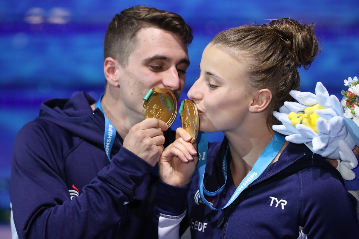 Le regard braqué sur l’écran géant de la Duna Arena de Budapest, Matthieu Rosset, Laura Marino et leur entraîneur Alexis Coquet ne respirent plus. Des minutes qui semblent être des heures et une tension qui est à son comble avant le passage des Américains, leurs principaux concurrents. En tête du concours, les Français le resteront finalement jusqu’à la fin de la compétition. Et lorsque le classement apparaît enfin, les congratulations s’enchaînent à un rythme effréné. Toute l’équipe de France s’empresse de rejoindre les deux premiers médaillés mondiaux de l’histoire de la discipline. Benjamin Auffret tombe dans les bras de Matthieu Rosset. Noël Porcu, le responsable du plongeon à la FFN, n’en croit pas ses yeux et enlace Laura Marino. Après une Marseillaise pleine d’émotion, les champions du monde du Team Event se présentent devant les journalistes du monde entier, la breloque autour du cou. Les yeux rougis et le téléphone portable qui ne s’arrête pas de sonner, Laura Marino et Matthieu Rosset ont encore bien du mal à mesurer la portée de leur exploit.