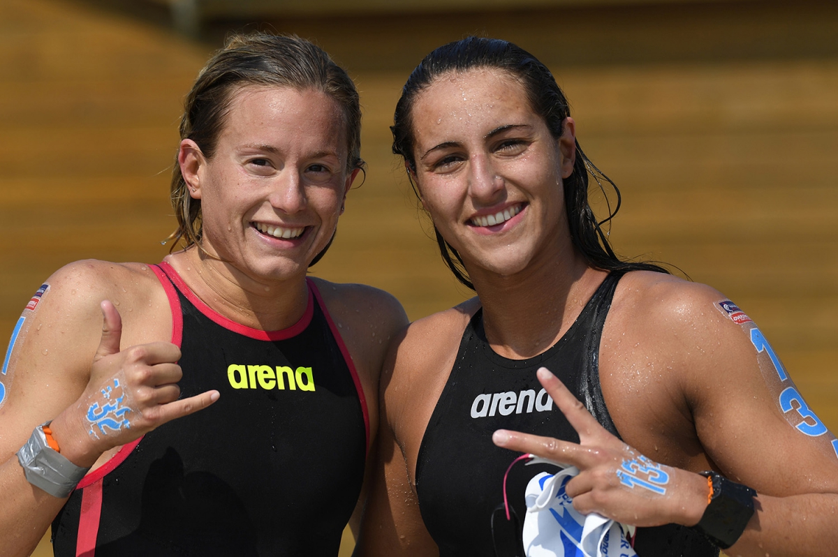 Aurélie Muller et Océane Cassignol pendant les championnats de France d'eau libre à Gravelines (KMSP/Stéphane Kempinaire).