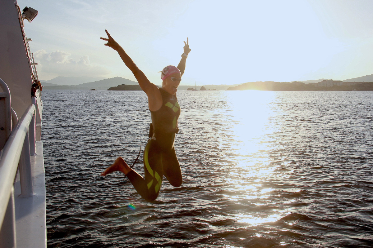 Le jour se lève sur la Grande Bleue quand les concurrents se jettent à l'eau (photo : Jean-Pierre Chafes).