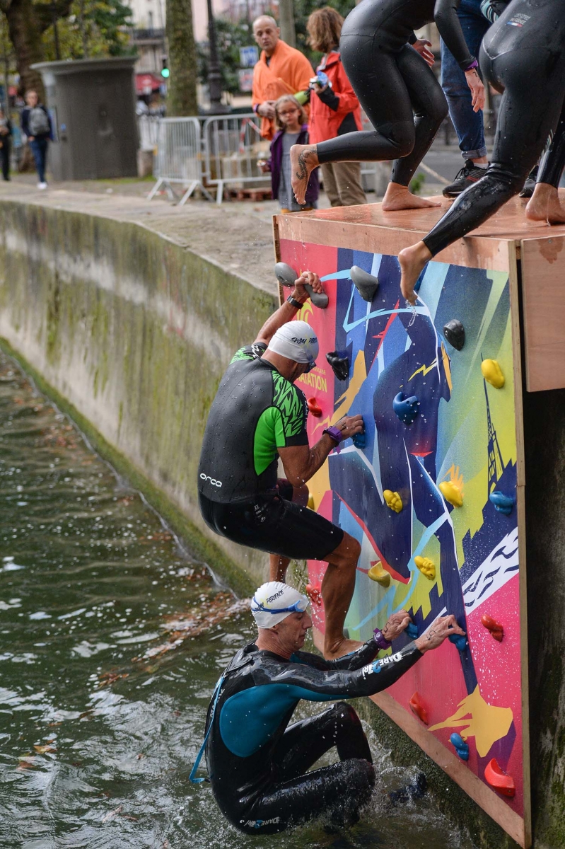 Des jeunes et des moins jeunes, il y en avait, motivés, acharnés et déterminés à venir à bout des quatre obstacles disséminés au fil d’un parcours de 600 mètres de natation. D’abord, l’échelle, puis le franchissement de la passerelle Richerand, le mur d’escalade et enfin un sprint de deux cent mètres sur tapis avant un plongeon final pour atteindre l’arche d’arrivée. De quoi faire monter le cardio et tétaniser les bras et les jambes. « Je me suis engagé sur cette épreuve complétement par hasard », témoigne Sébastien, commercial parisien de 36 ans. « J’ai vu passer une pub sur Instagram et j’ai eu envie de relever ce challenge sportif. Je pratique plusieurs sports, mais je ne suis pas vraiment un nageur. L’idée, c’était de me trouver un objectif accessible qui ne soit pas uniquement axé sur la natation. S’il n’y avait eu qu’une compétition de natation, je ne me serais sans doute pas inscrit. »