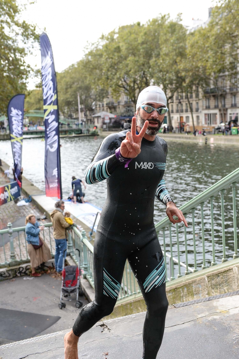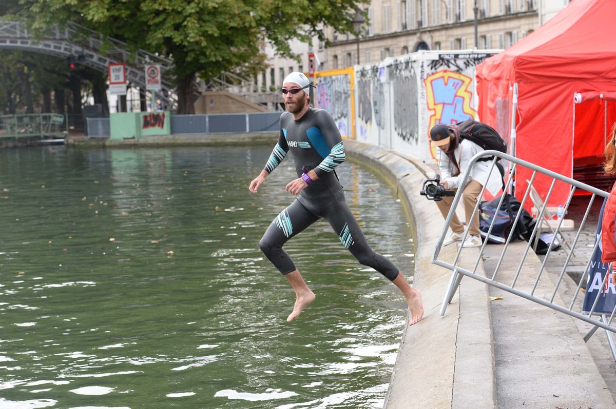 « Nager dans le Canal Saint-Martin, en plein cœur de Paris, c’est le petit truc en plus de cette compétition », reprend Sébastien. « Honnêtement, je m’attendais à ce qu’il y ait davantage de participants. C’est un peu dommage par rapport à ce qu’ont mis en place les organisateurs, mais ce n’est que la première édition (…) Les obstacles ne m’ont pas posé trop de problèmes. Pour moi, le plus dur, ça a surtout été la température de l’eau (16°C). J’ai éprouvé quelques difficultés avec le premier obstacle (l’échelle) parce qu’on s’est retrouvé à plusieurs au moment de le négocier. Du coup, il a fallu attendre que le concurrent qui me précédait soit arrivé en haut pour que je m’élance à mon tour. La passerelle n’a pas été difficile, si ce n’est qu’en sortant de l’eau les muscles tétanisent un peu et qu’il faut gravir des escaliers, puis en redescendre d’autres avant de replonger dans le canal. Quant au sprint final sur à peu près deux cent mètres, ce n’était pas si compliqué à gérer, même en fin de parcours. »