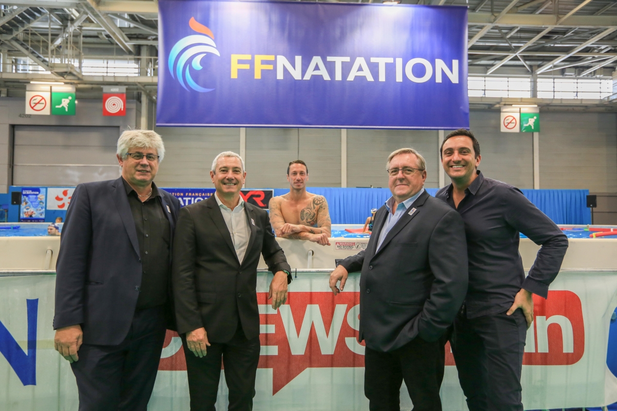 De gauche à droite: Bernard Dalmon (trésorier de la FFN), Gilles Sézionale (président de la FFN), Frédérick Bousquet, Jean-Jacques Beurrier (président délégué de la FFN) et Laurent Ciubini (directeur général de la FFN). (Photo: Adrien Rozès).