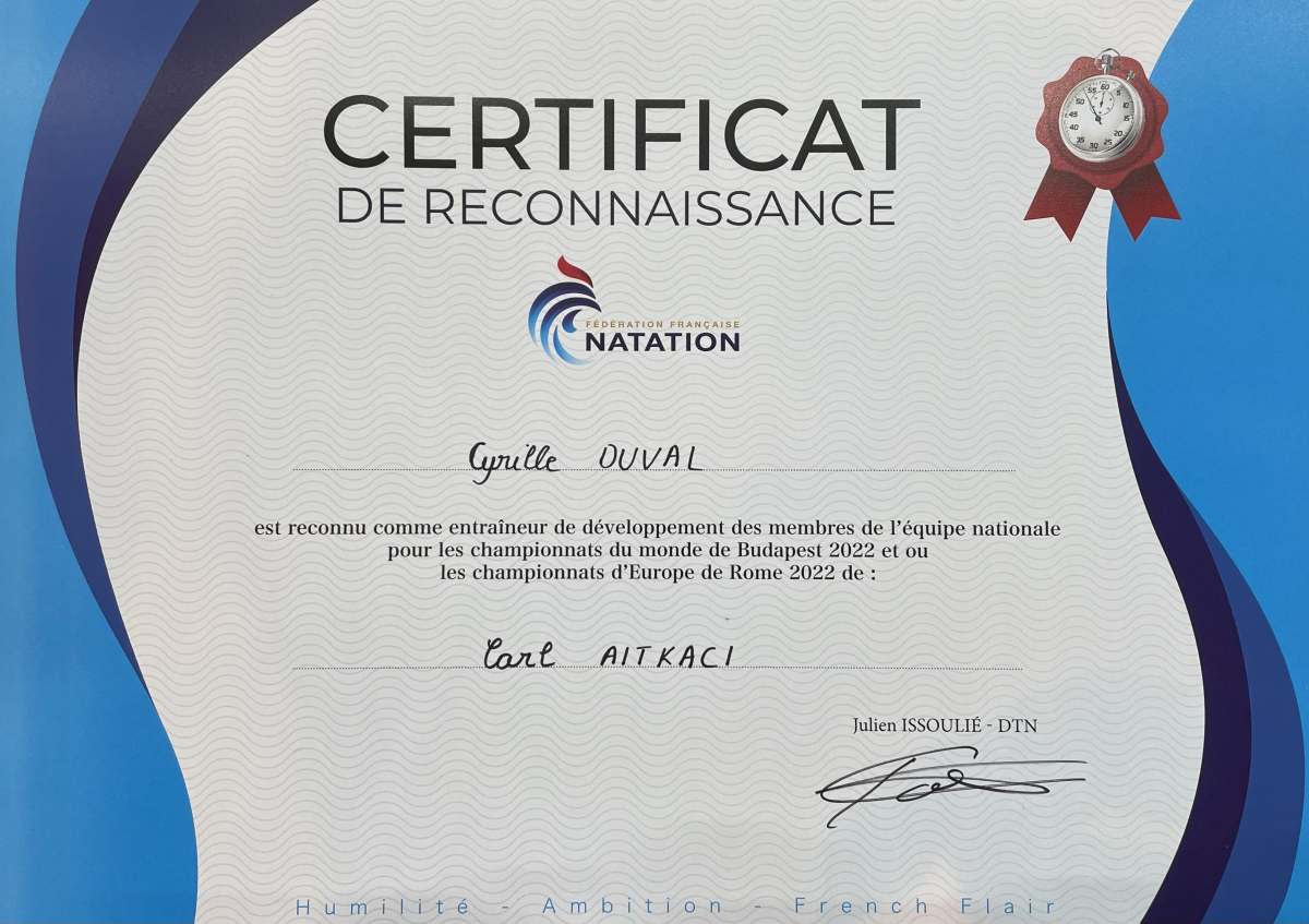 Lors de la troisième journée des championnats de France de Chartres, la Fédération Française de Natation a remis un certificat de reconnaissance à tous les entraîneurs qui ont contribué à la formation des nageurs qui ont garni les rangs de l’équipe de France séniors cet été à Budapest et Rome. « Avec Jacco (Verhaeren, directeur des équipes de France), on a beaucoup échangé sur la reconnaissance des entraîneurs » commence Julien Issoulié, le Directeur Technique National de l’instance fédérale. « On a établi le constat qu’on se focalisait beaucoup sur les entraîneurs qui font la performance en oubliant que si un nageur évolue à ce niveau c’est parce qu’il a bénéficié d’une bonne formation au départ. Nous souhaitions donc mettre en lumière les coaches qui ont formé, entre l’âge de 14 ans et 17 ans, les nageurs qui ont composé l’équipe de France cet été. » Résultat: un joli moment d’échange et de partage entre les nageurs, leurs entraîneurs formateurs et le public de Chartres présents à l’occasion des championnats de France. « Je ne m’attendais pas à ce que les nageurs soient aussi fiers que leurs entraîneurs soient là. Les retours sont positifs et nous allons pérenniser cela dans les années à venir. » Une initiative saluée par l’ensemble des coaches et notamment Cyrille Duval, l’entraîneur formateur du brasseur Carl Aitkaci. « Je trouve ça important que la fédération reconnaisse le travail des entraîneurs formateurs. Avec Carl, on travaille ensemble depuis de nombreuses années et nous avons assuré la continuité au sein des Étoiles 92 avec Olivier Sangaria. Carl était content qu’on reçoive cette distinction. » Au-delà du plaisir ressenti par les différents acteurs, cette initiative permet également de valoriser des structures et de permettre aux parents de jeunes nageurs de les identifier. « C’est effectivement un moyen de flécher les meilleurs entraîneurs et clubs formateurs du pays » confirme Julien Issoulié. Cyrille Duval lui emboîte le pas. « C’est important que les gens voient que nous sommes capables de former de bons nageurs et de les garder sur du long terme. »