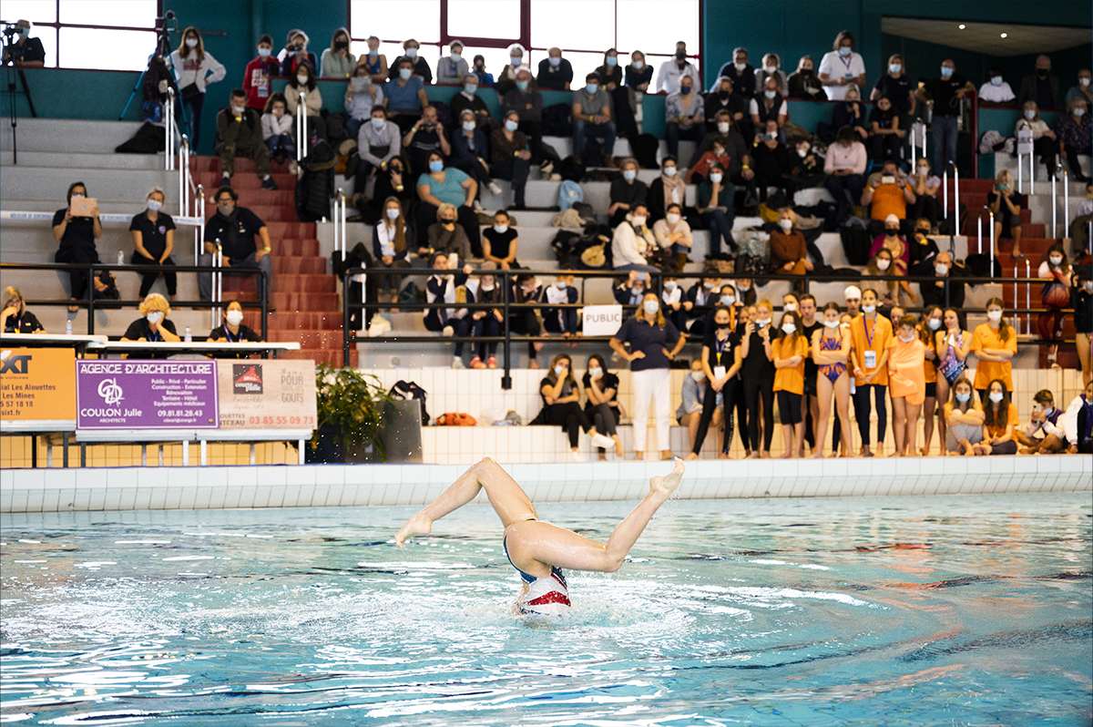 Oriane Jaillardon, du Grand Paris Sud Corbeil-Essonnes, termine première chez les juniors, avec une prestation artistique et technique impressionnante et un score de 82.98. Depuis qu'elle a rejoint l'INSEP cette année, Oriane, de son propre aveu, a progressé. Désormais entraînée par Marie Annequin, ancienne capitaine de l'équipe de France, elle a particulièrement travaillé sur "l'énergie" qu'elle transmet dans ses prestations. Le changement de rythme apporté par cette nouvelle vie n'a pas été facile, mais elle a pris ses marques et travaille beaucoup son rôle de voltigeuse. Sur ces championnats de France, Oriane me confie "Ça fait du bien de revoir le public, la piscine est plus vivante, et notre sport est aussi un spectacle. C'est important d'avoir des spectateurs.".