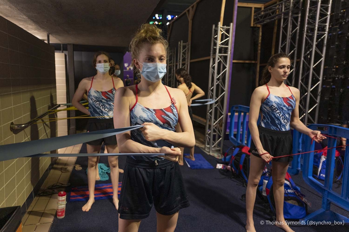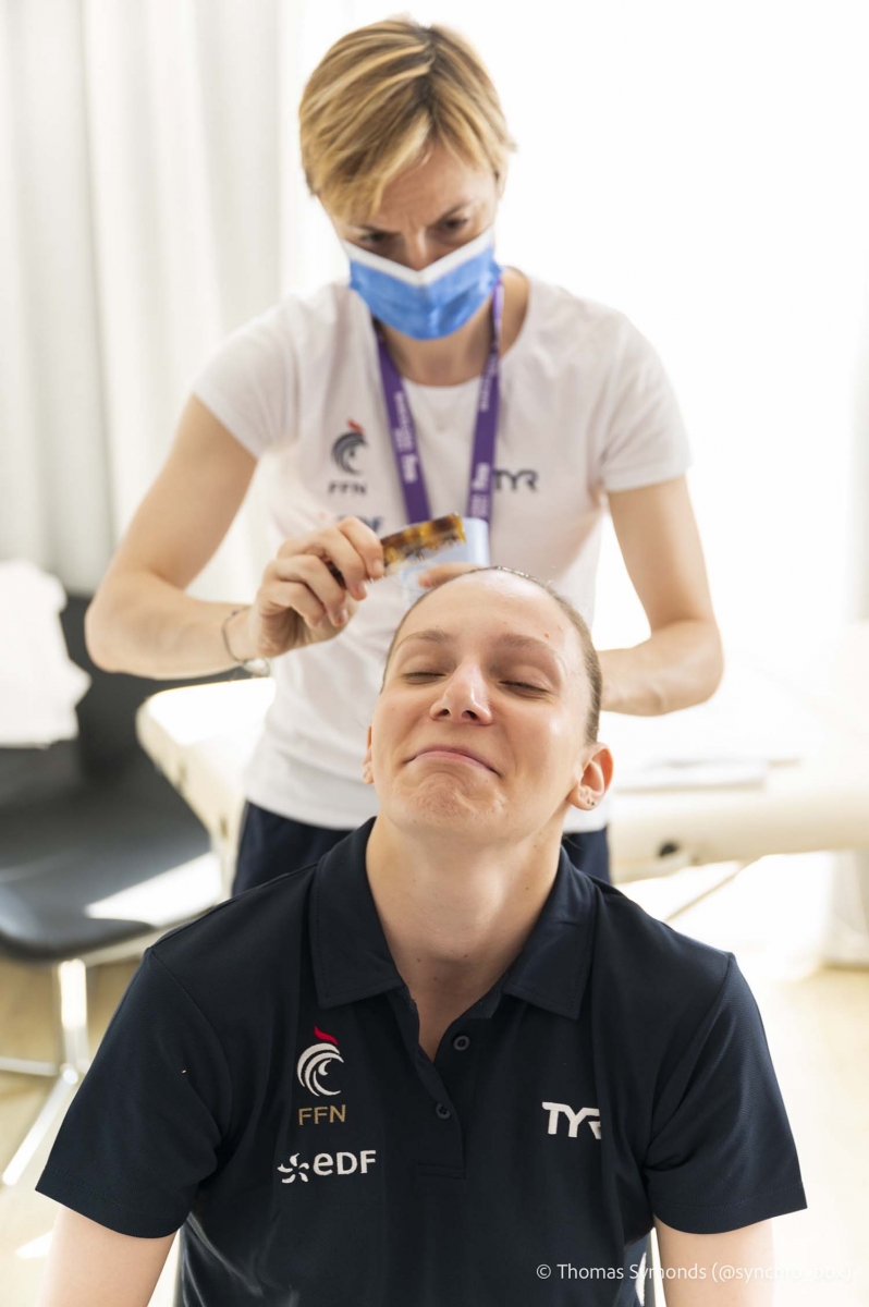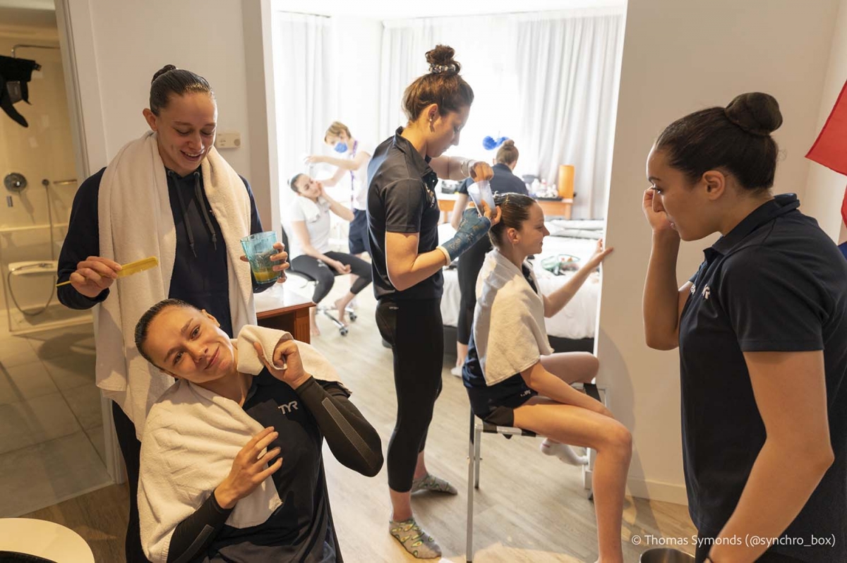 Le premier entraînement de la journée démarre à 7h30 après un réveil musculaire au bord du bassin. Chaque pays a droit à deux heures d'entraînement aquatique et d'un passage en musique. Covid oblige, la piscine est découpée en morceaux virtuels et un ordre de circulation est établi afin d'éviter au maximum les rencontres. Dix heures, retour à l'hôtel pour mettre la « gélat » (la gélatine qui sert à tenir les cheveux et « coif » des nageuses, ndlr). Les filles sont détendues. Marie (Annequin), malgré son plâtre, aide ses coéquipières. C'est même plus facile pour enfoncer les pinces sans se faire mal et assurer la tenue du chignon. Chouchou (Laura Gonzalez) grimace lorsque Laure Obry (l'entraîneur) lui verse la gélatine chaude sur le crâne. « Je pleure de l'intérieur », livre-t-elle, mi sérieuse mi amusée.