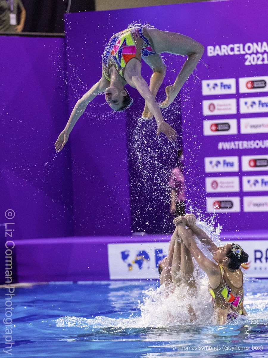 Les Françaises passent quatrième, après les Grecques et les Espagnoles, mais avant les Américaines. Elles livrent une prestation solide, une exécution rapide, puissante et technique. Pour autant, les Grecques les devancent avec une note de 87,39 points (contre 87,05 unités aux Tricolores). Les Américaines nagent remarquablement bien et terminent à quelques centièmes de l'équipe de France (86,85 points). « C'est la première fois que nous passons la barre des 87 points sur cette épreuve technique », indique Laura Tremble en sortant du bassin. Le combat continue.