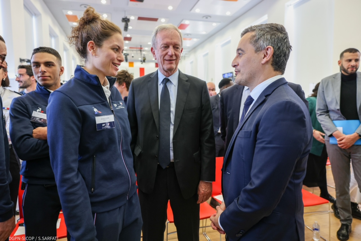 Emma Terebo en discussion avec le Ministre de l'Intérieur, Gérald Darmanin, lors de la présentation de l'équipe de la Police nationale, le 20 avril 2023