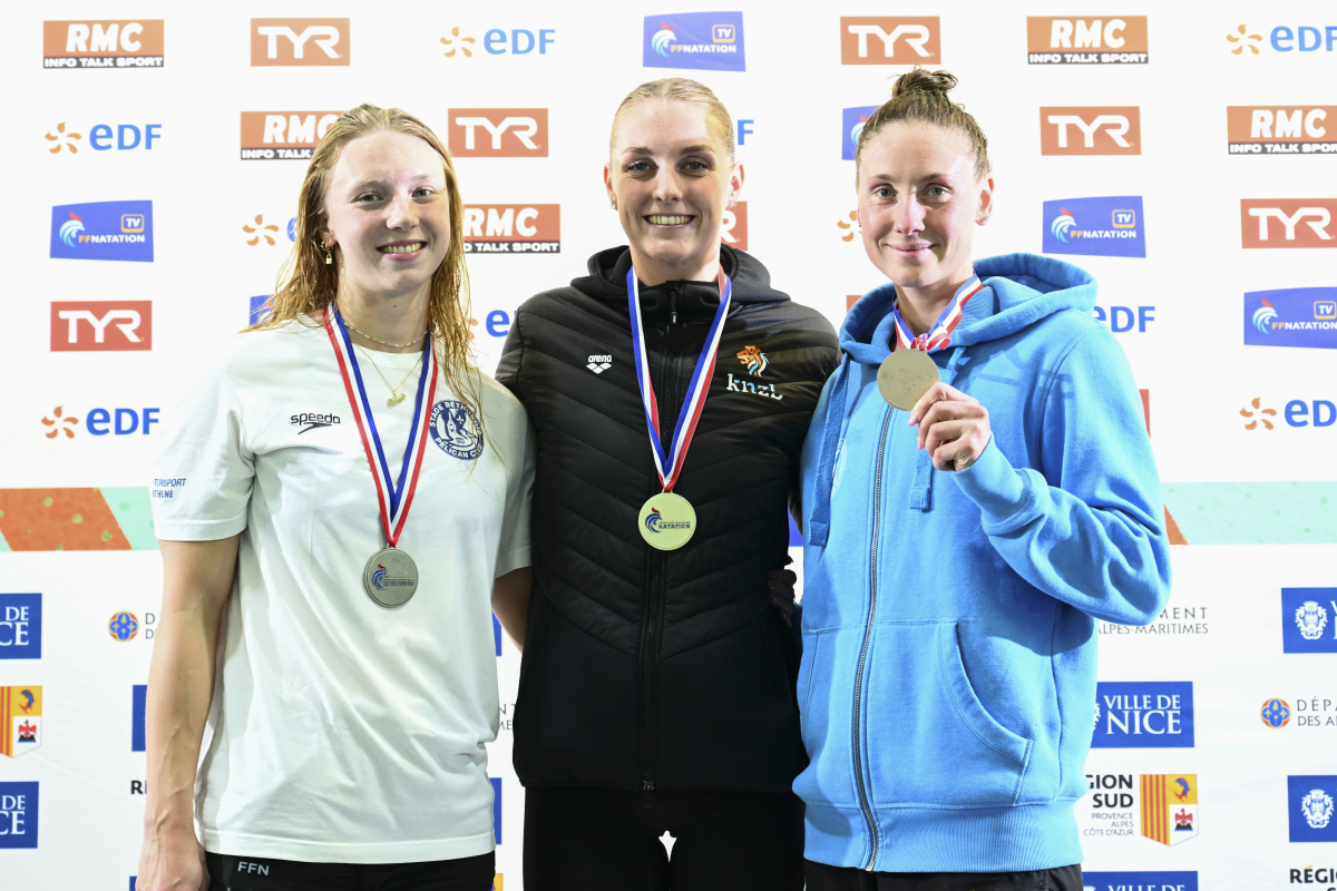 Océane Carnez (à gauche) sur le podium du 200 m nage libre en compagnie de Marrit Steenbergen et Anastasia Kirpitchnikova. (KMSP)