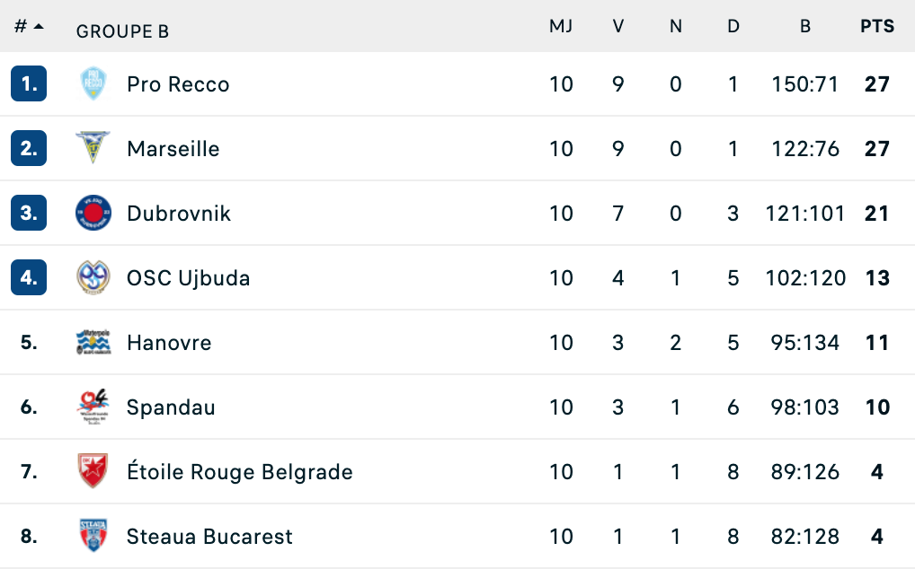 Dans les autres rencontres, Jug Dubrovnik a conservé sa troisième place grâce à son succès face à l’Etoile Rouge. Quant au Spandau, il garde ses chances de qualification après s’être imposé à Bucarest face au Steaua.