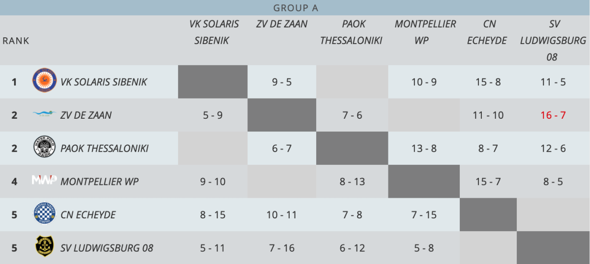 Les choses ne se seront pas vraiment mieux passées le soir face aux locaux du PAOK. Les Montpelliérains n’auront rivalisé qu’un peu plus d’une période (2-2) avant de voir les grecs prendre le large (6-2 en début de troisième période puis 11-4 en début de quatrième). Avec ces deux défaites, les Héraultais se retrouvent à la quatrième place. Mais rien n’est perdu pour la seconde place. Il faudra tout de même remporter le dernier match contre les hollandais de De Zaan et espérer une défaite du PAOK contre Solaris, tout en soignant la différence de buts. Quoiqu’il en soit, le MWP sera bien au second tour puisqu’il ne pourra plus être rattrapé par Echeyde ni Ludwigsburg.