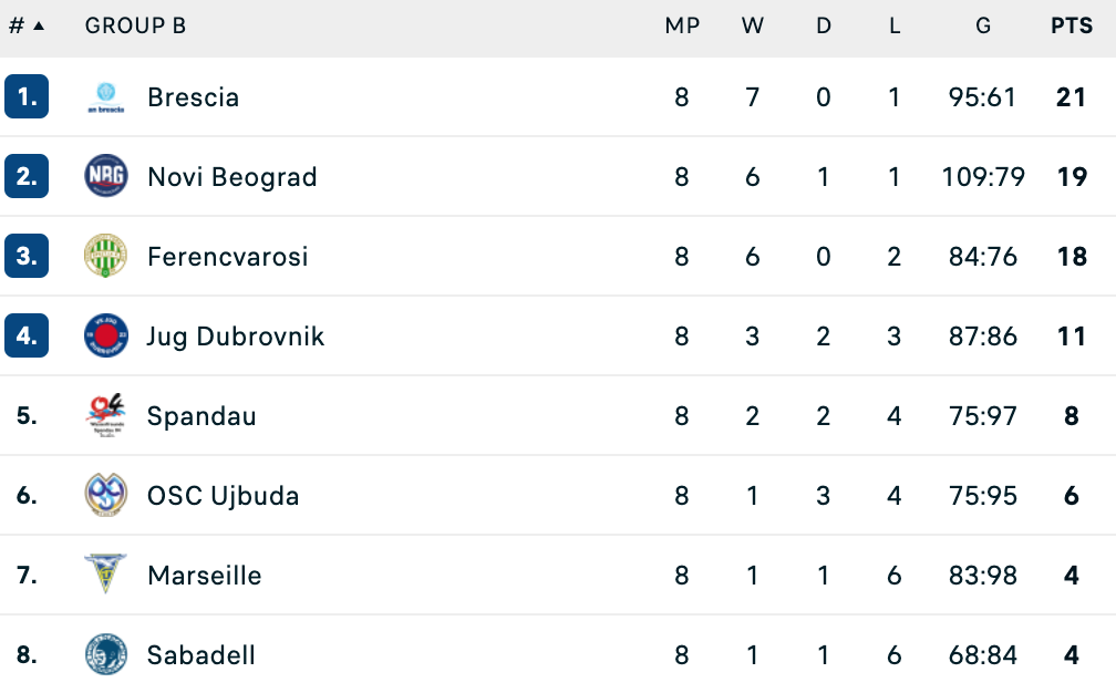 Marseille n’a donc pas à rougir d’autant que les résultats des autres rencontres leur permettent de rester à sept points du quatrième, Jug Dubrovnik, battu par le Spandau (11-13). La défaite de Sabadell à Novi Beograd (16-11) permet au Cercle de monter d’un cran au classement, grâce à la différence de but. Enfin, Ferencvaros conforte sa troisième place grâce à sa courte victoire dans le derby Hongrois face à l’OSC Budapest (12-11).