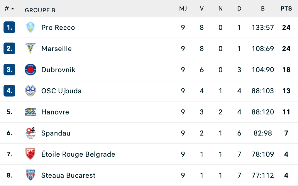 Après un début de rencontre sur les chapeaux de roues (1-5 à la fin du premier quart temps), Marseille s’est fait peur en voyant le Spandau revenir à sa hauteur en seulement cinq minutes (5-5). Mais le doute aura été de courte durée puisque dans la minute qui suivait il reprenait l’avantage (5-6) puis prenait son envol sur le quart temps suivant avant de se mettre définitivement à l’abri (5-11 à la fin du troisième quart temps). Un succès qui fait beaucoup de bien aux Phocéens et qui leur permet de rester dans le trio de tête. Un trio qui a creusé l’écart sur le reste du groupe puisque l’OSC Budapest a été battu par Jug Dubrovnik tout comme le Waspo Hanovre face à Pro Recco. Dans le dernier match, l’Etoile Rouge et le Steaua Bucarest ne sont pas parvenus à se départager.