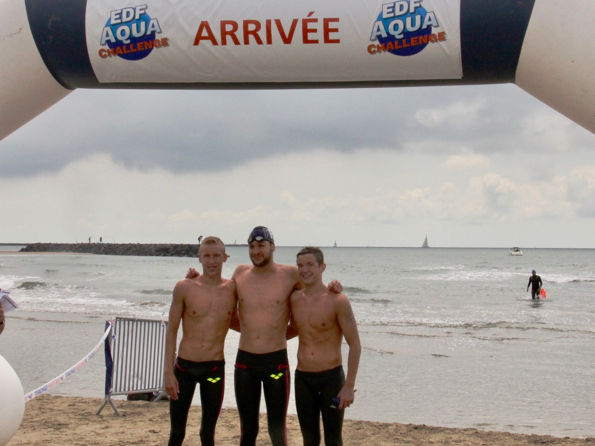Axel Reymond (au centre) a remporté le 10 km de l'EDF Aqua Challenge du Cap d'Agde devant Marc-Antoine Olivier (à gauche) et Clément Batté (à droite). (Photo: Jean-Pierre Chafes).