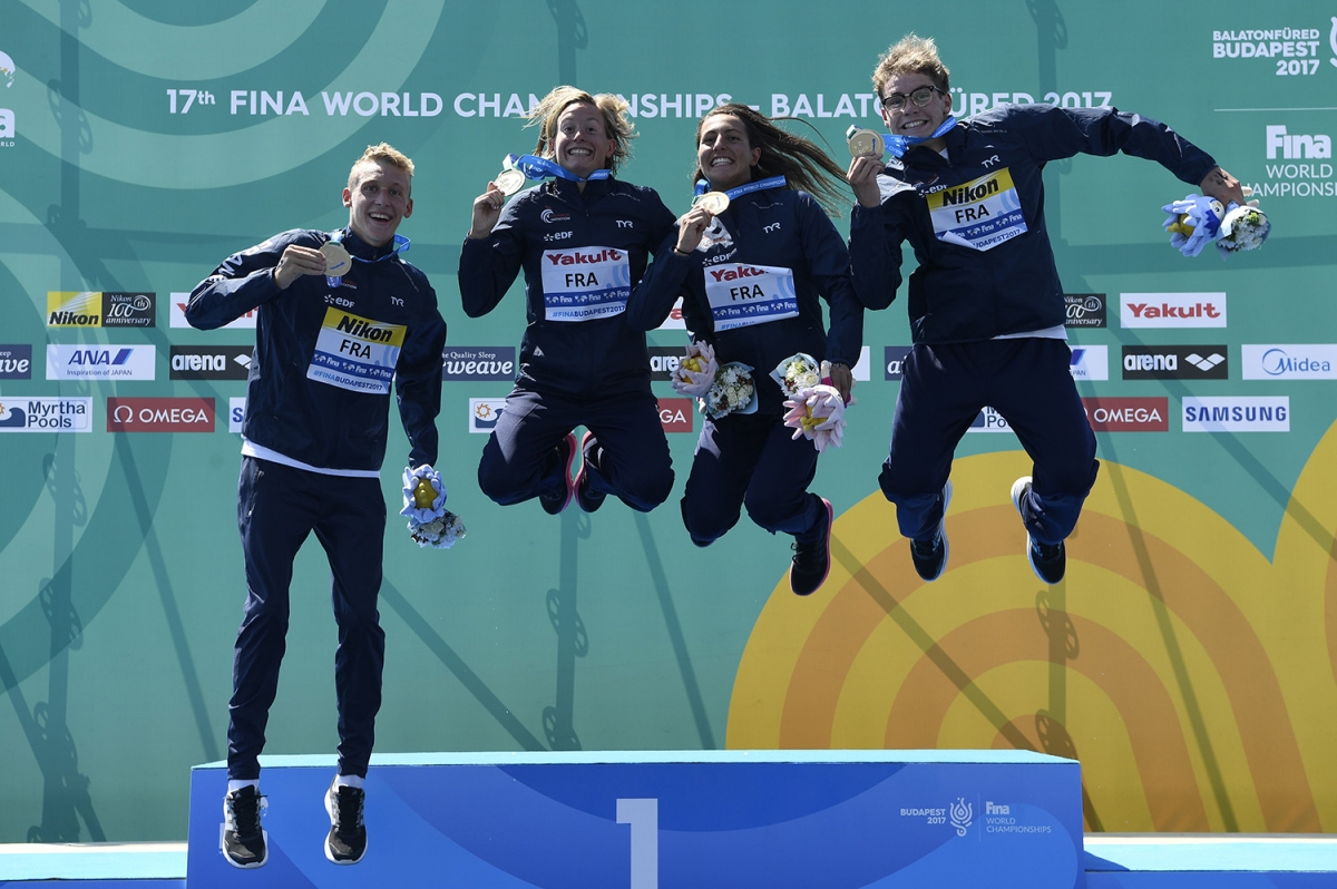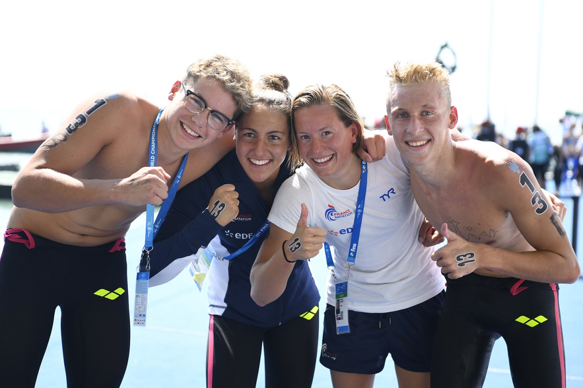 L'équipe de France d'eau libre vainqueur du Team Event aux Mondiaux de Budapest (KMSP/Stéphane Kempinaire).