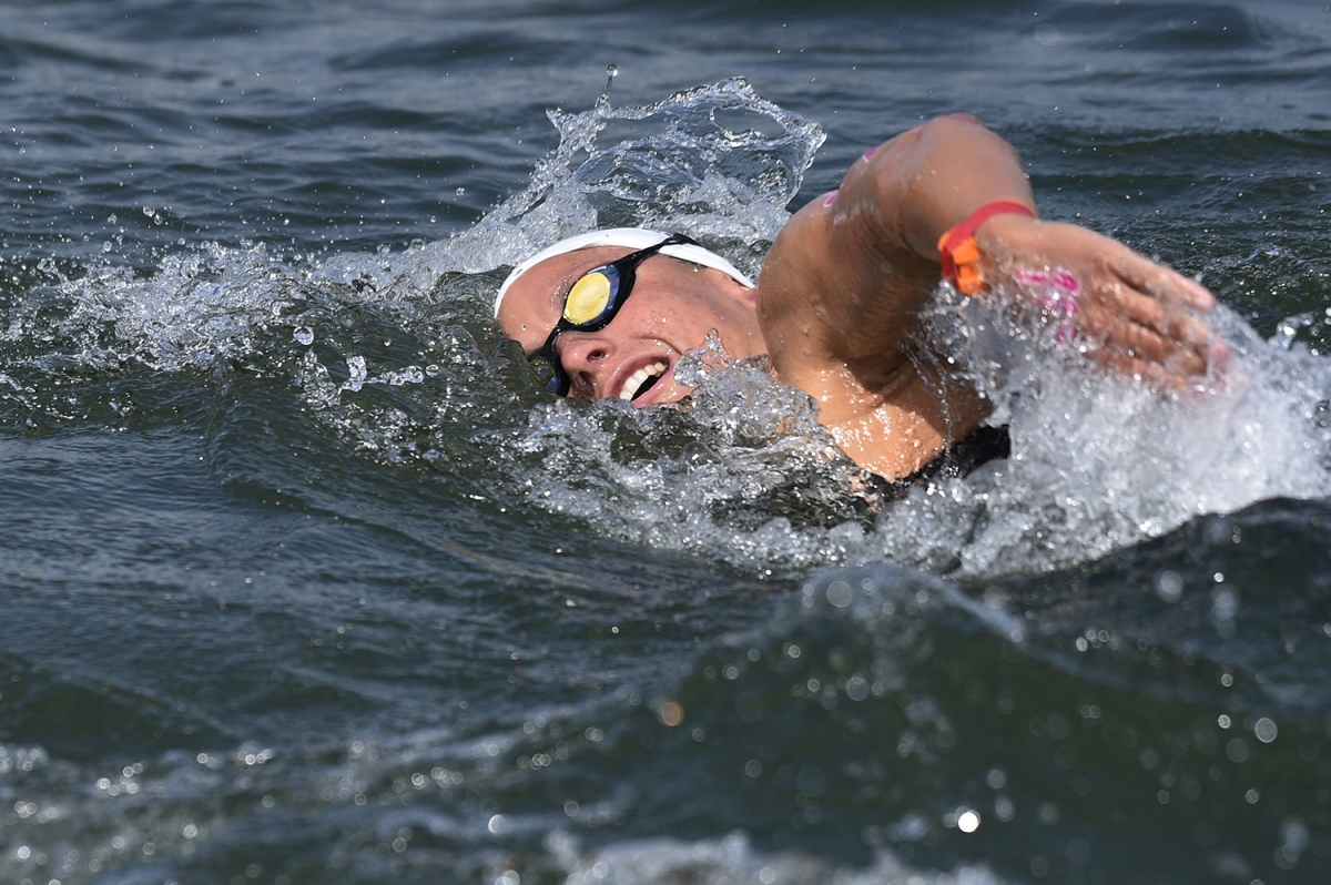 En prenant la cinquième place du 10 km de l'étape de coupe du monde d’Abu Dhabi, Aurélie Muller a montré qu'en dépit d'une saison 2017-2018 consacrée à ses études de diététique, elle n'avait absolument rien perdu de son talent pour l'eau libr (KMSP/Stéphane Kempinaire).