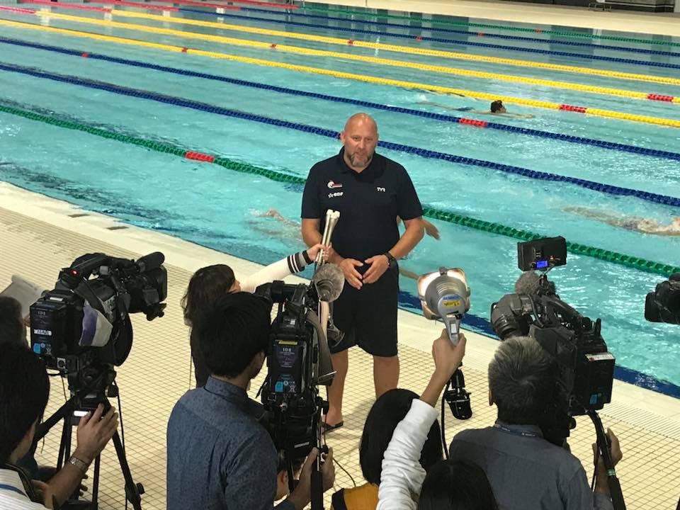 Le directeur de l'eau libre à la FFN, Stéphane Lecat, répond aux questions de la presse nippone lors de l'arrivée de l'équipe de France à Kanazawa. (DR).