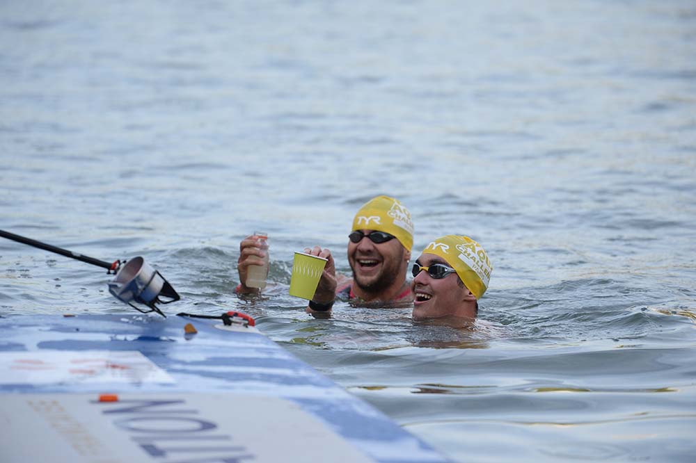 Clément Batté et Axel Reymond, double champion du monde du 25 km, au ravitaillement du 10 km disputé le samedi 14 septembre (FFN/Philippe Pongenty).